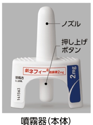 処方時には使用方法を説明しますが、コツはプッシュのときに「ネフィー®点鼻液」のノズルが鼻の孔から出ないように、”しっかり先端を鼻の中に入れたまま力強くワンプッシュする“こと、と言えます。